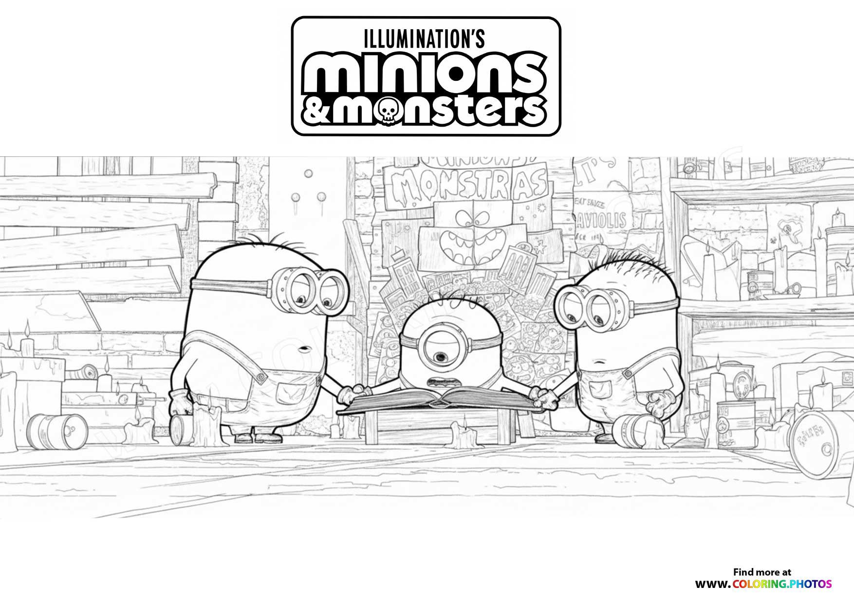 Minions & Monsters reading a book. Coloring page to print or download and color for your kids.