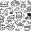 Thanksgiving food elements. Coloring page to print or download and color for your kids.
