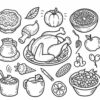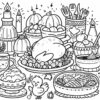 Thanksgiving food table. Coloring page to print or download and color for your kids.