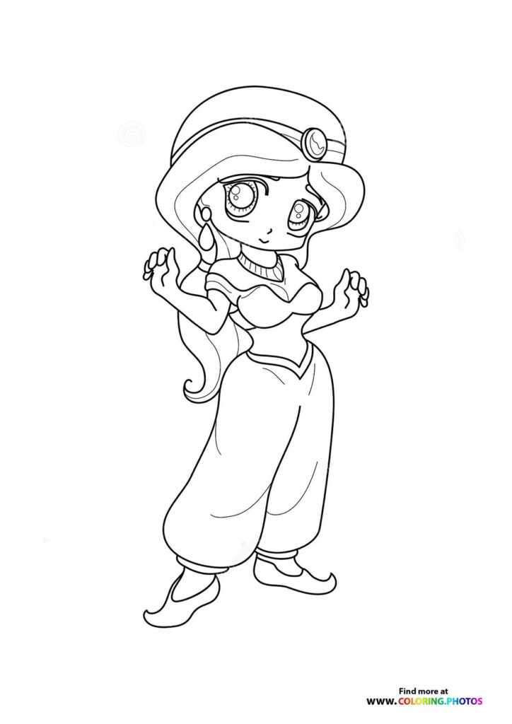 Little Jasmine Disney princess. Coloring page to print or download and color for your kids.