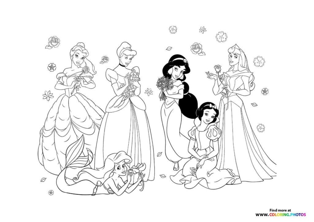 Cute Disney princesses. Coloring page to print or download and color for your kids.